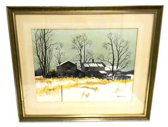 | watercolor depicting weathered grey clapboard house and barn complex in snow, black trees silhouetted against luminescent pale b | |