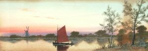 Tranquil river view with a windmill in the distance and sailing on calm waters
