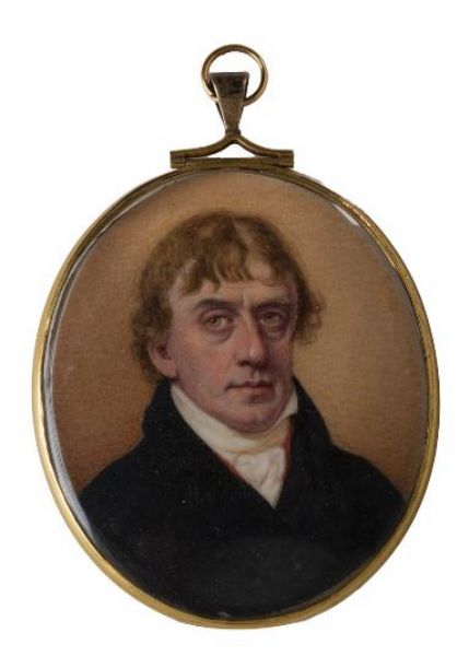 | PORTRAIT MINIATURE OF A GENTLEMAN IN DARK COAT, RED WAISTCOAT AND CREAM-COLORED CRAVAT. | |