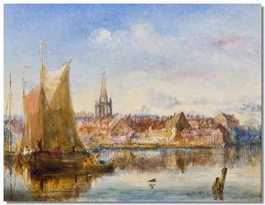 A river landscape with city beyond