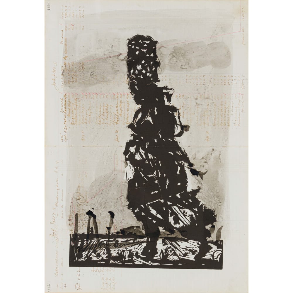 | Linocut and ink wash on found paper | |