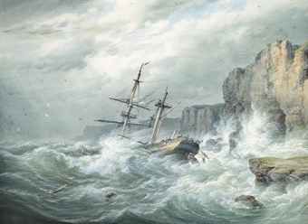 | A stiff onshore breeze with a dismasted merchantman foundering on the rocks | |