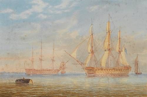 | A Third Rate of 74-guns coming to anchor in Spithead with other ships of the fleet nearby | |