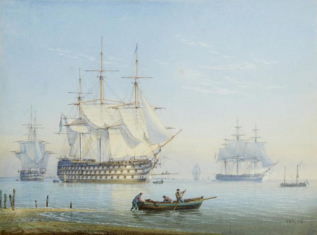 Men O'War off shore in a calm water