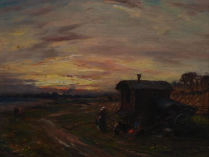 Gypsie encampment with caravan and figure at sunset