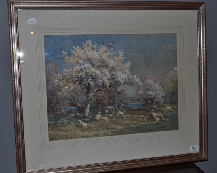 Sheep grazing under blossom trees in a river landscape