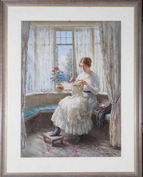 THE ARTIST'S WIFE SEATED IN A BAY WINDOW SEWING