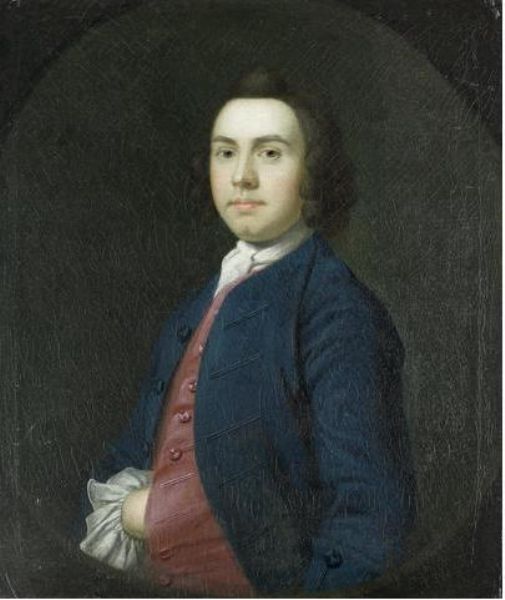 Portrait of a gentleman, half-length, in a blue coat and red waistcoat, within a painted oval