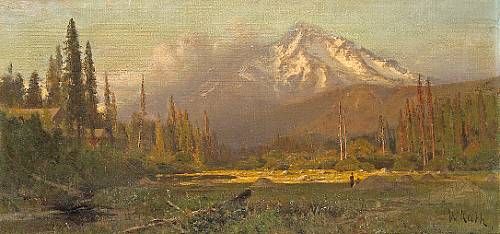 | Cabin Hideaway near a Sunlit Clearing with a Mountain in the Distance, thought to be Mt. Shasta, 1888 | |