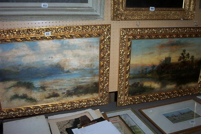 | a coastal scene with sand dunes, gulls etc, the other showing a river scene at sunset with church, red roofed buildings, figure | |