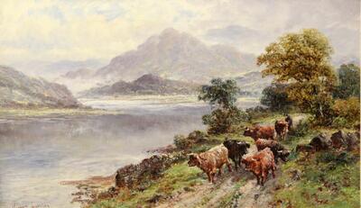 A drover and highland cattle beside a loch in a mountainous landscape; A drover and highland cattle crossing a bridge in a highl