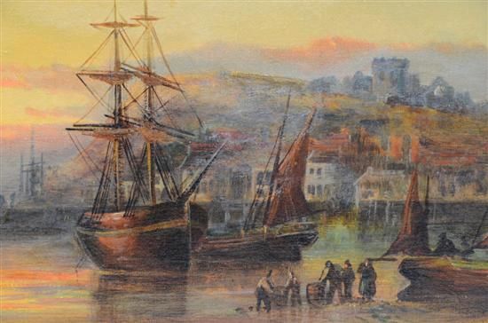 coastal landscape with moored boats and figures