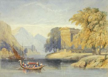 | An Italian lake scene with boats and a ruined classical temple | |