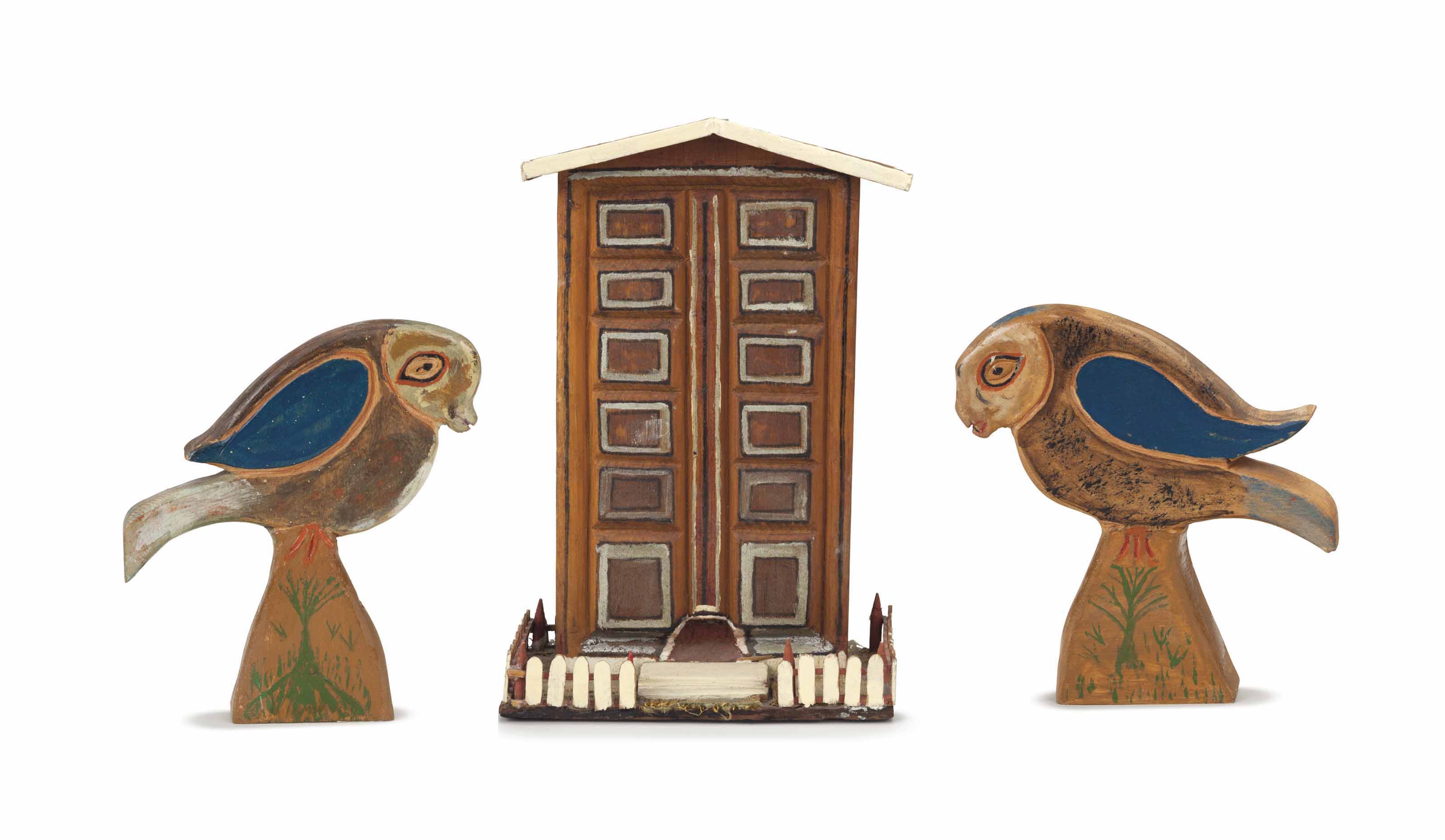 | Acrylic paint and fabric on carved wood | |