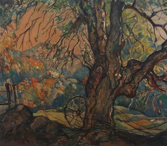 LANDSCAPE WITH OLD TREE AND WAGON WHEEL