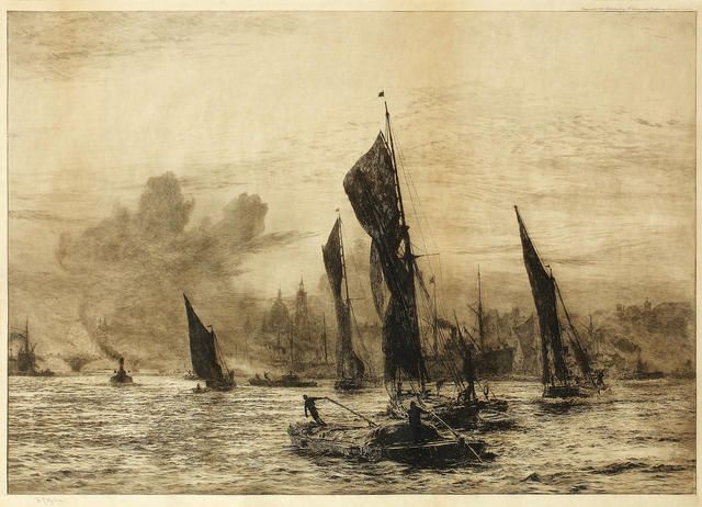 Barges and steamers on the Thames with St. Pauls and London Bridge beyond