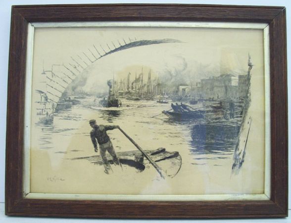 | Busy Thames scene viewed from beneath a bridge with barges and warehouses, figure to the fore | |