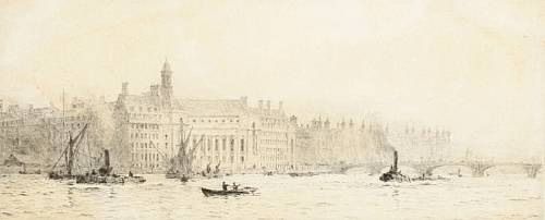 | 'County Hall and St Thomas' Hospital from the north bank of the Thames' | |