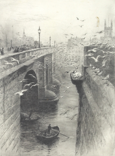 William Lionel Wyllie RA (British, 1851-1931): London Bridge, with a flock of sea gulls, dry point etching on paper, signed in pencil lower left margin, with title lower right, 30 by 22cm, framed size 49 by 36cm. Provenance: The Estate of Mr Joseph B | |