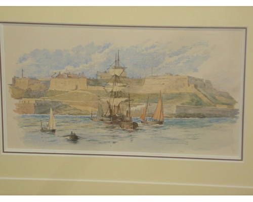 | Fishing boat, tug and other vessels off a coastal fort | |