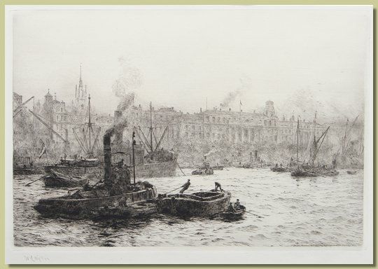 | busy river scene, with tugs and fishing boats and buildings beyond | |