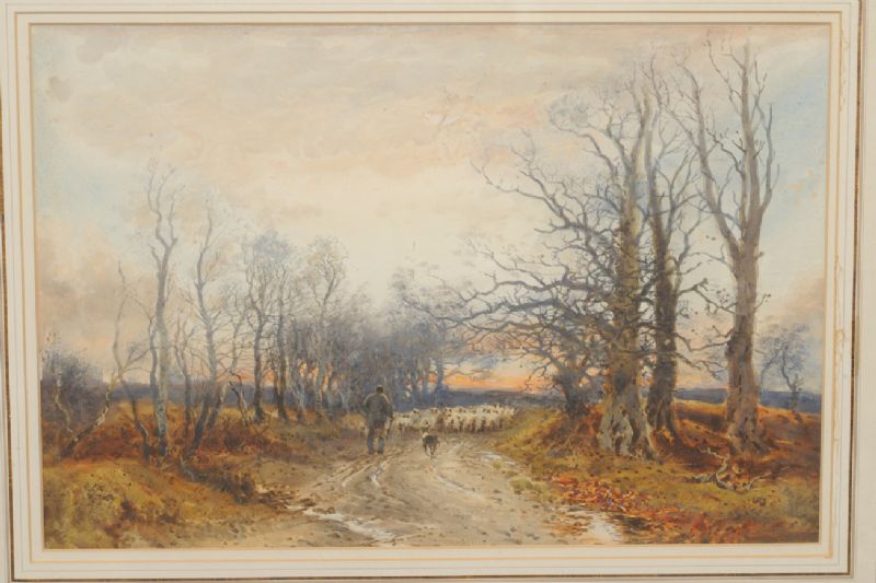 Drover and Shepherd with Sheep on a Country Lane at Sunset