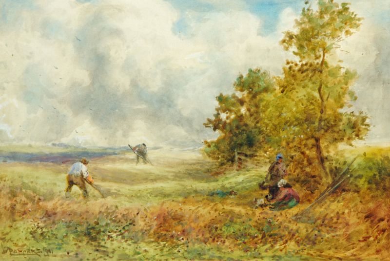 harvest scene with figures in landscape.