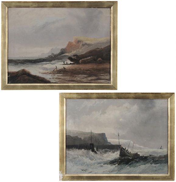 | Two costal scenes: Rescue Boat in rough seas, figures on shore | |