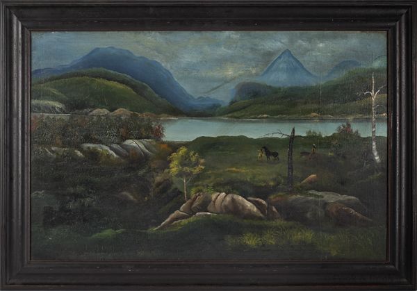 | landscape with Native Americans standing by a lake with mountains in the distance | |