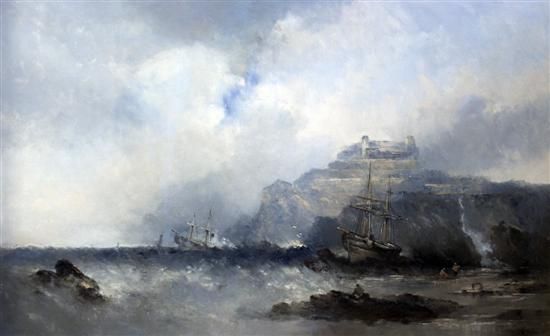 Bamburgh castle with ships wrecking on the shore