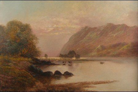 | On the Glaslyn, North Wales, cattle watering, figures in a boat, mountains in the distance | |