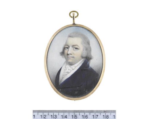 | A Gentleman, wearing blue coat, white waistcoat, stock and cravat, his hair powdered. Gold frame, the reverse glazed to reveal s | |