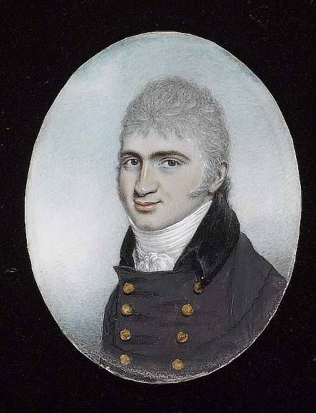 | A Gentleman, wearing double-breasted dark grey coat with black collar and tied white stock, his hair powdered. | |