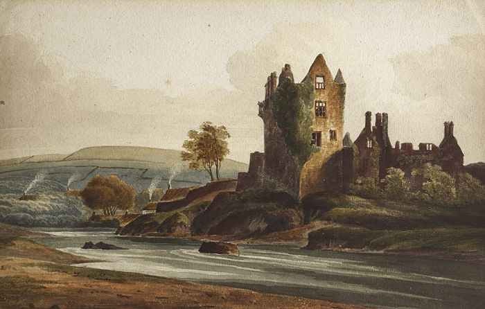 VIEW OF MANOR RUINS WITH COTTAGES and ROCKY COASTAL SCENE AT SUNSET (A PAIR)