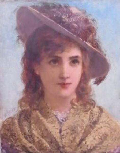 Head and shoulders of a pretty young girl wearing a wide brimmed hat and lace shawl