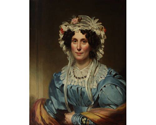 | Portrait of a lady, bust length, wearing a pale blue dress and white lace bonnet | |