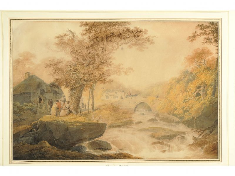 COUNTRY FOLK BY A COTTAGE NEAR A ROCKY RIVER