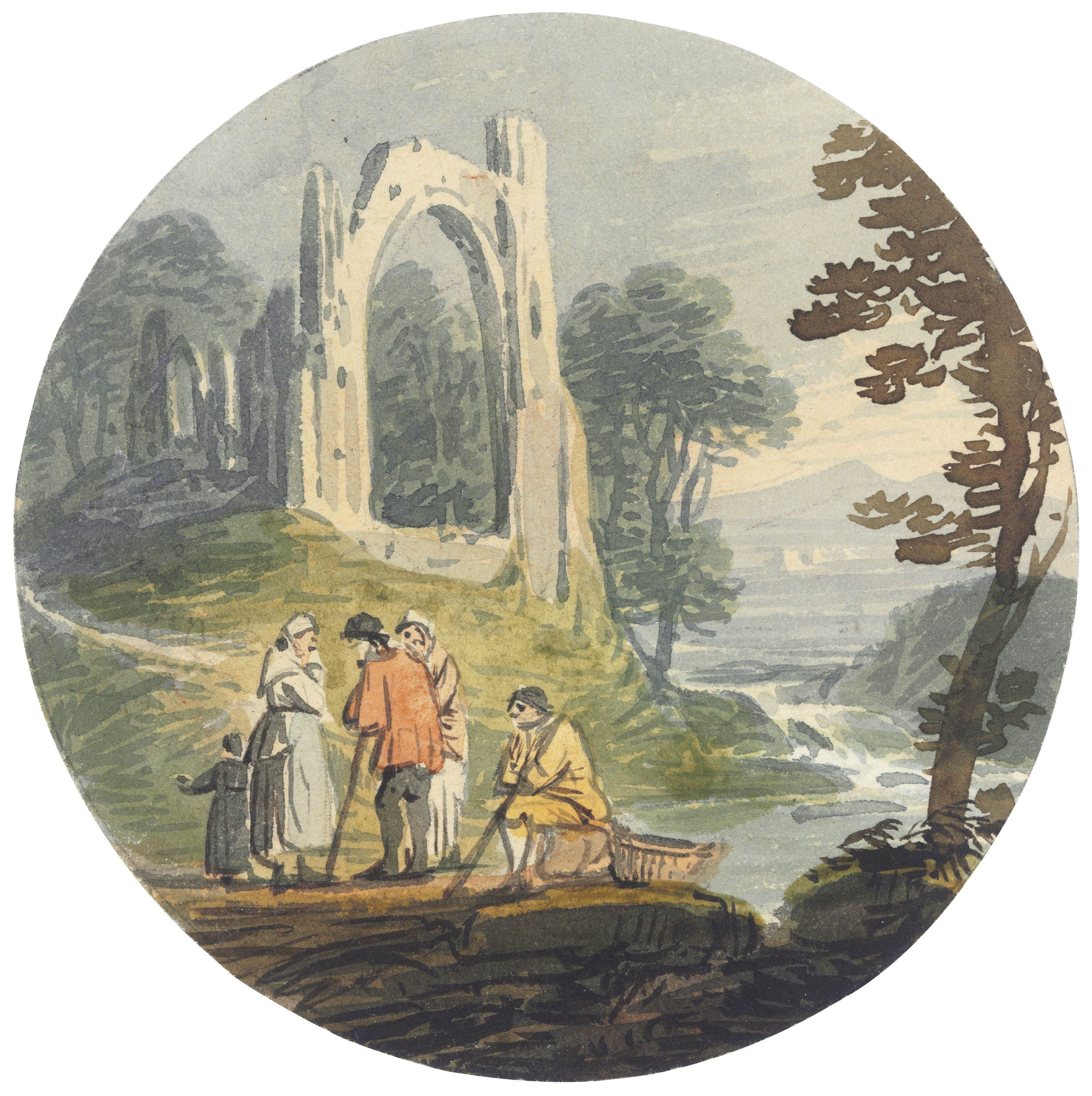 | Eight landscape study roundels; including travellers before a ruin; a waterfall before a castle; a traveller crossing a footbrid | |
