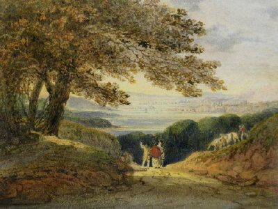 Figures in conversation on a path with extensive view of an estuary beyond