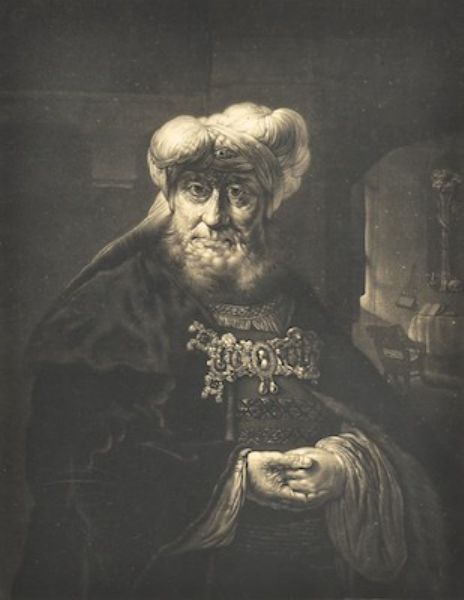 | A mezzotint after Rembrandt depicting King Uzziah, published by John Boydell, London | |
