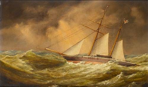 | A big schooner of the Royal Yacht Squadron battling through heavy seas under reduced sail | |