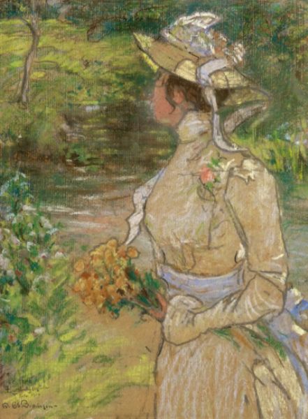 A YOUNG LADY WITH FLOWERS BY A STREAM