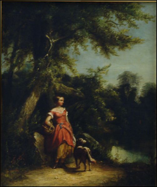 WOMAN AND DOG BY A STREAM