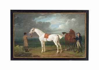 | The grey racehorse 'Lamprey' and a bay racehorse held by grooms in a landscape | |