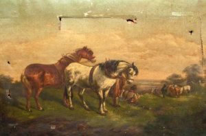 Farm hands with horses in a rural scene