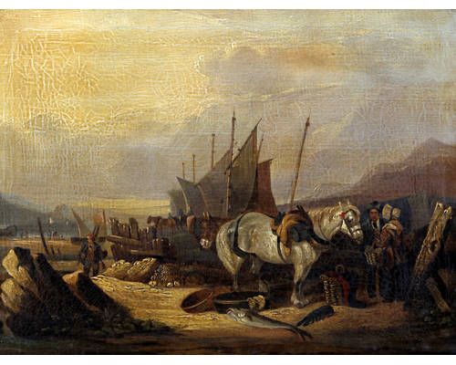 Fisherfolk and horses on the shore