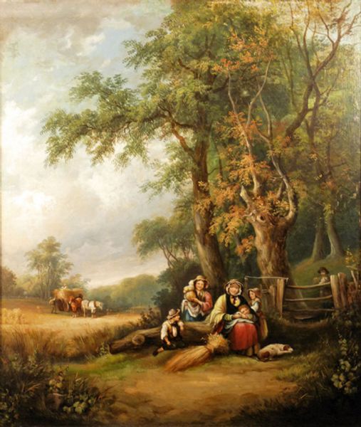 HARVESTER'S FAMILIES SITTING BY A TREE, A WAGON BEING LOADED IN A FIELD NEARBY