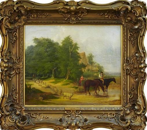 AT THE WATERING POOL WITH FARMER LEADING SHEEP