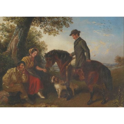 GENTLEMAN RIDER AND HIS DOG GREETING A GYPSY COUPLE IN A WOOD