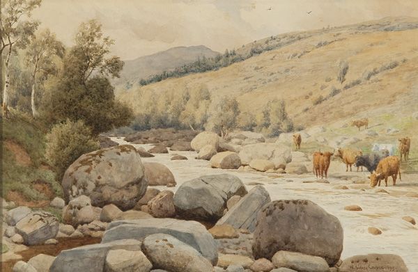 | Bergslandskap med nötkreatur vid vattendrag | |